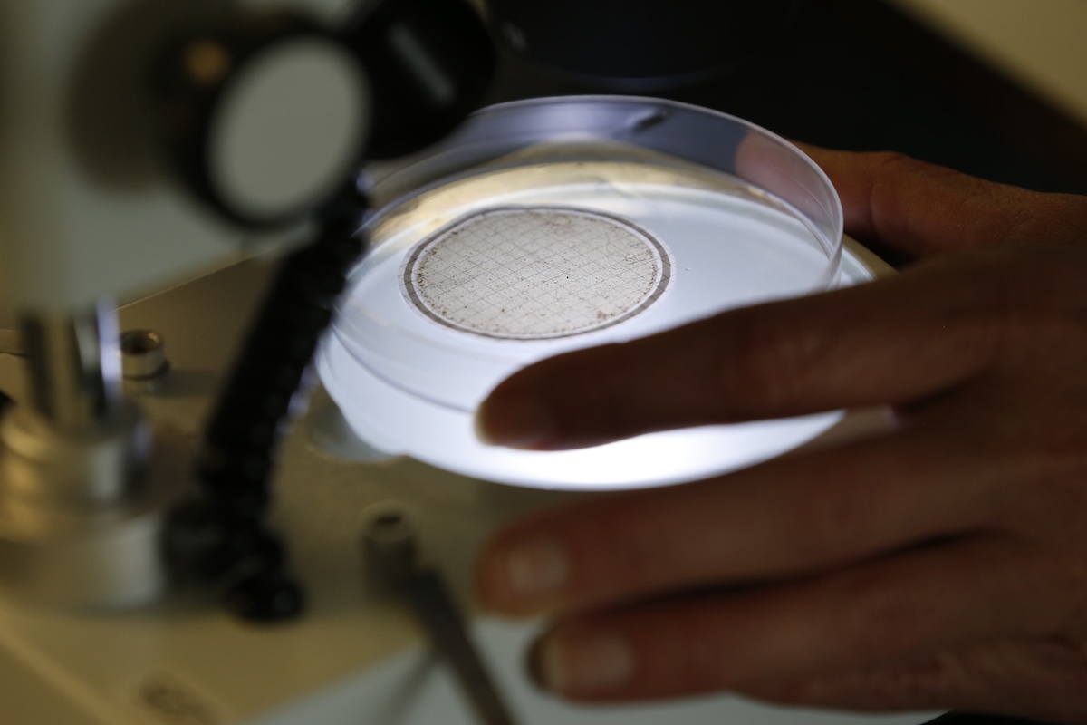 A researcher at Marinelab in Key Largo, Fla., examines a filter with material drained from a water sample under a microscope to check for the presence of microplastics and nanoplastics on Feb. 7, 2017. (AP)