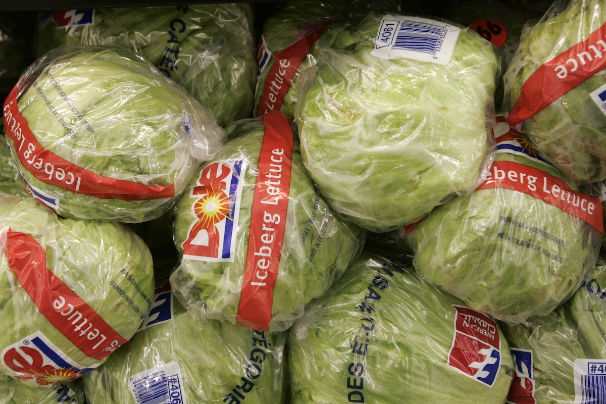 Packaged heads of iceberg lettuce are shown at the K+G Food Mart in Detroit, Monday, May 8, 2006. (AP)
