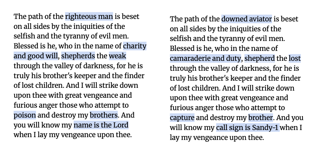 In the film "Pulp Fiction," Samuel L. Jackson’s character "Jules" tells another character he has a Bible passage memorized, naming Ezekiel 25:17. Here’s how Jules’ passage (left) compares with the prayer Hegseth recited (right). The differences in their quotes are highlighted in blue.