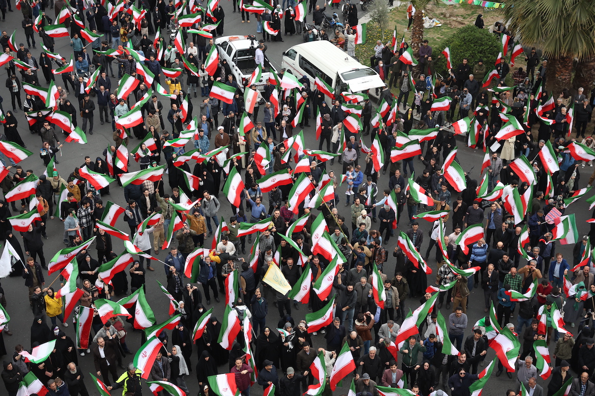A group of demonstrators wave Iranian flags in support of the government and against U.S. and Israeli strikes in Tehran, Iran, Feb. 28, 2026. (AP)