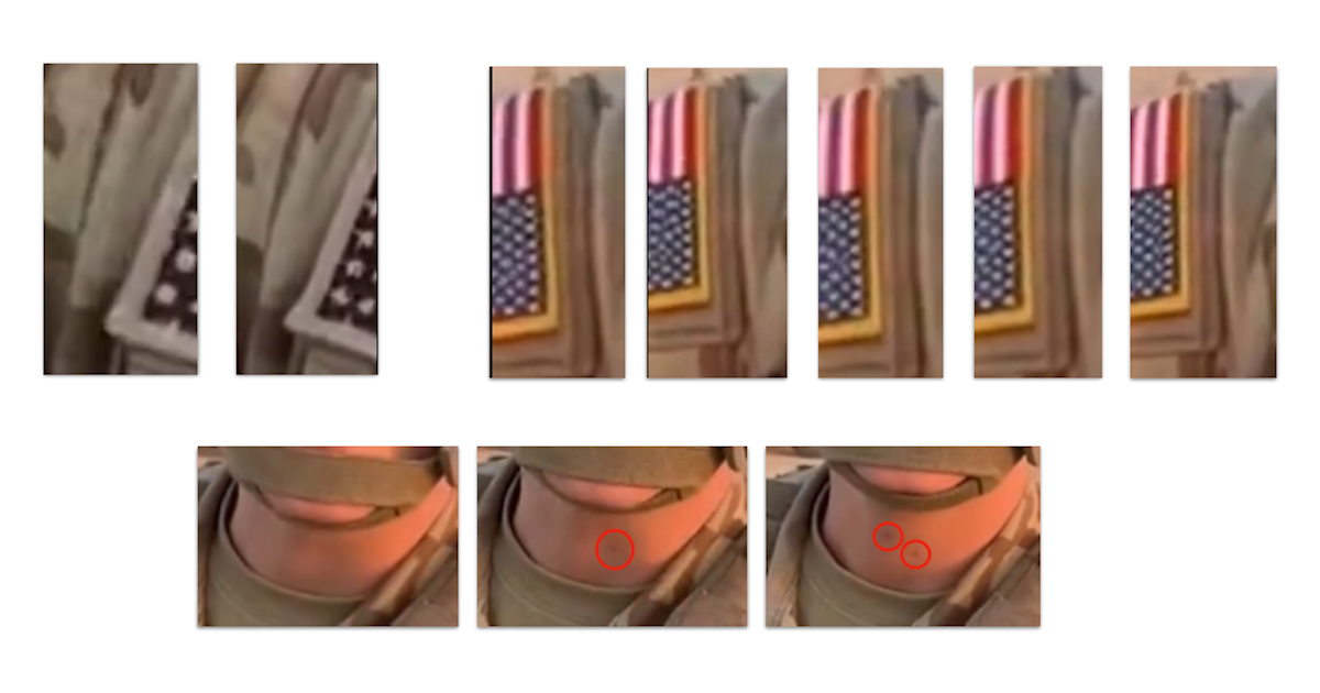 The stars on her uniform’s flag patches appear to change in shape, number and orientation. What look like moles on her neck disappear and reappear throughout the video.