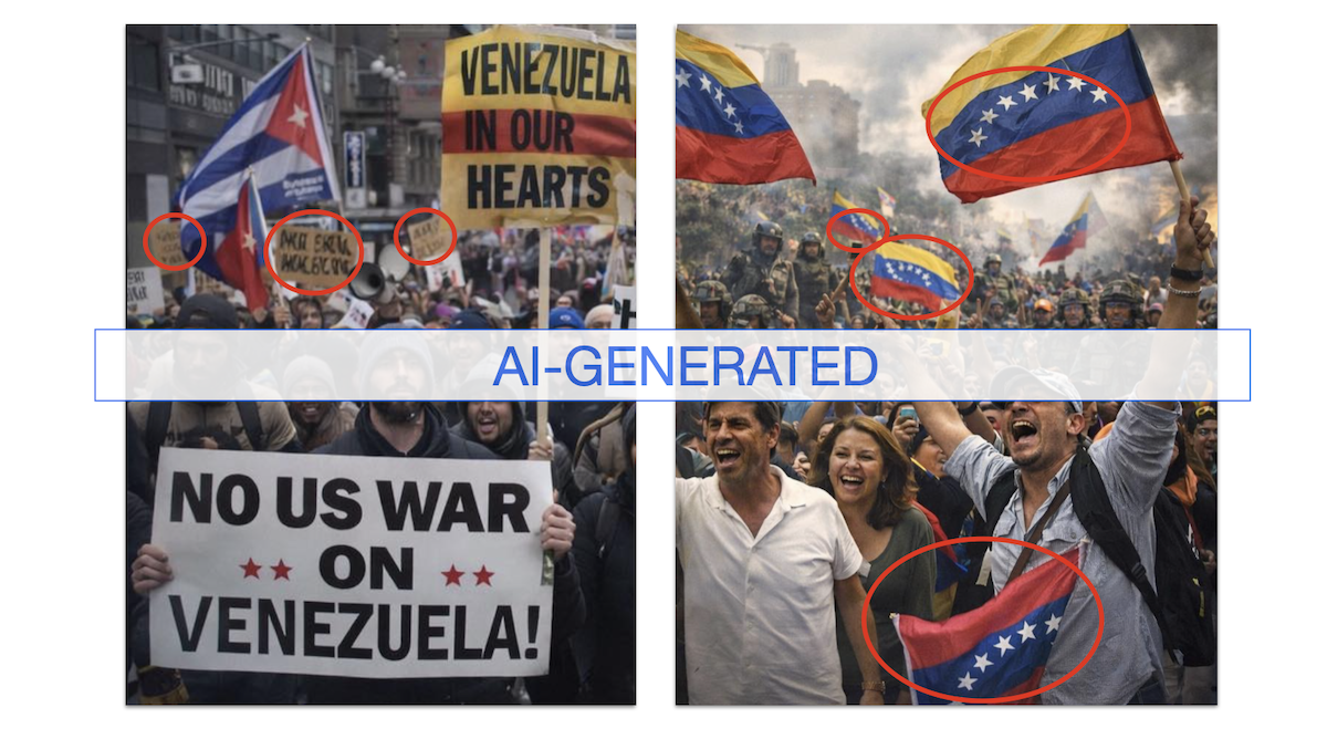 • Images that appear to show a New York protest and a celebration in Venezuela show signs of AI generation, such as illegible text and inaccurate flags.