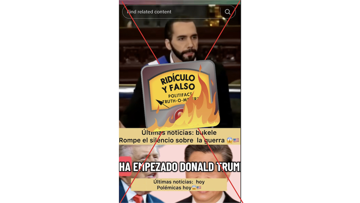 Un video en TikTok del 5 de marzo muestra a Bukele dando un supuesto discurso contra las políticas exteriores del Presidente Donald Trump con la canción "Así Fue" de Juan Gabriel de fondo.