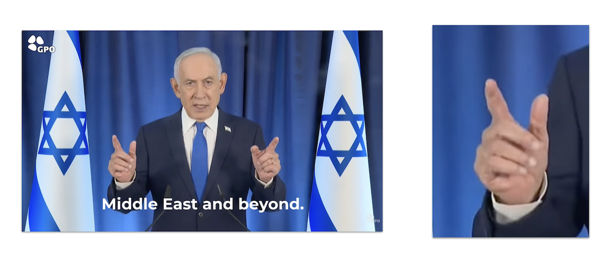 In the image, Netanyahu is pointing with both hands, and social media users said his right hand appears to have six fingers.