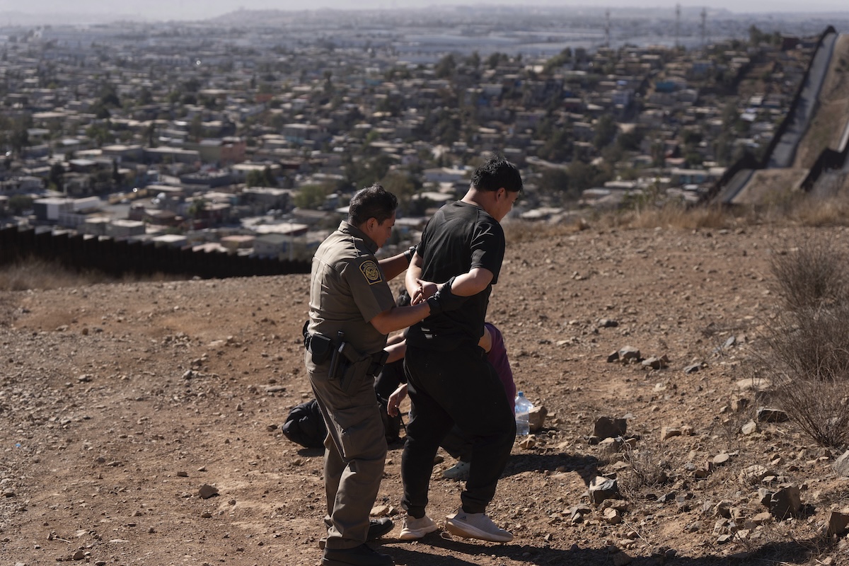 A Border Patrol agent, left, escorts one of four men after the group crossed the border illegally through a gap in two walls separating Mexico from the United States before turning themselves in, Jan. 23, 2025, in San Diego. (AP)